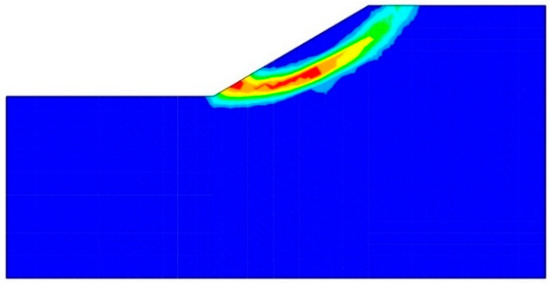 The strength reduction method is employed to calculate the safety factor (FOS) for the unsupported slope under gravity. The safety factor is calculated to be 1.15 in this research. When the slope has no reinforcement, the safety factors calculated by Cai and Ugai [33], the FLAC, and Bishop’s simplified method are 1.14, 1.15, and 1.13, respectively [34]. Figure 3 shows the critical slip surface within the slope.
