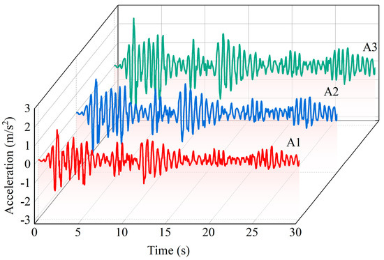 The acceleration time-history curves of the three monitoring points in the slope with no support under seismic loading are shown in Figure 4. The dynamic response characteristics of these monitoring points display similarity to the input seismic wave (Figure 3). The peak accelerations of points A1, A2, and A3 are 1.62 m/s2, 1.80 m/s2, and 2.54 m/s2, respectively.