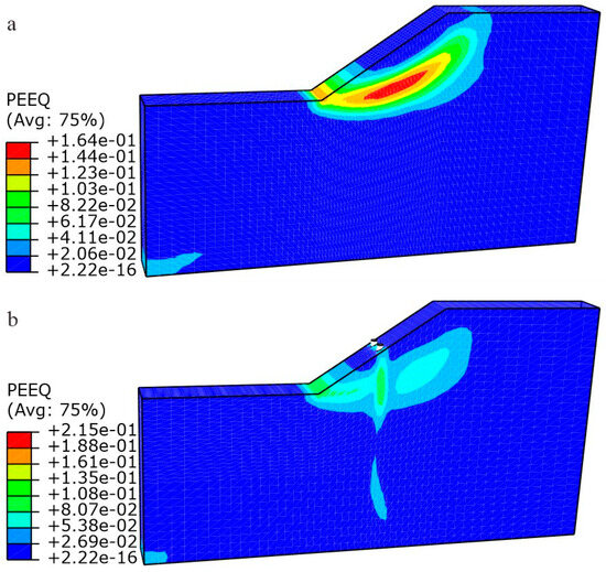 Equivalent plastic strain is a measure of cumulative plastic deformations during seismic loading processes, which provides a comprehensive representation of the cumulative effect of seismic loading [56]. Figure 5 illustrates the equivalent plastic strain cloud diagrams in the slope with different reinforcement schemes after seismic loading. It can be observed from Figure 5 that the unsupported slope experiences a through-going sliding surface extending from the slope toe to the slope crest. The plastic zone of the slope reinforced by piles is cut into two segments due to the influence of the piles (Figure 5b); and therefore, the overall failure of the slope is constrained. Notably, the pile-anchor structure further enhances the reinforcement area, and the plastic strain primarily occurs in the soil in front of the piles (Figure 5c).