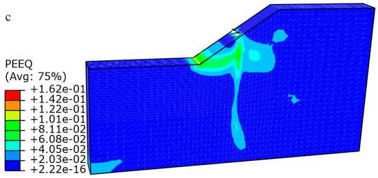 Equivalent plastic strain cloud diagram in the: (a) unsupported slope; (b) pile-supported slope; (c) pile-anchor-supported slope.