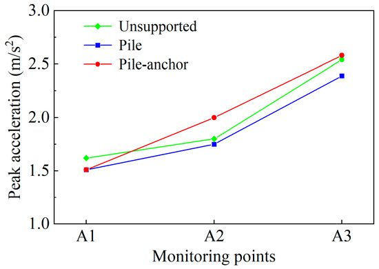 Peak accelerations of the monitoring points under different support conditions.