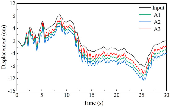 Figure 7 shows the peak accelerations of the monitoring points in different reinforcement schemes. Under horizontal loading, the acceleration response of the slope exhibits a nonlinear elevation amplification effect. Figure 8 shows the horizontal displacement measured in the slope reinforced by the pile-anchor structure. The horizontal displacement of each monitoring point agrees well with the displacement of the input seismic wave. Significant deviations from the input baseline occur near the peak acceleration of the input seismic wave (Figure 2a), indicating that the deformation of the slope is mainly caused by the peak acceleration.