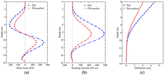 Pile behavior characteristics for the pile-supported and pile-anchor-supported slope models: (a) Shear force; (b) bending moment; (c) deflection.