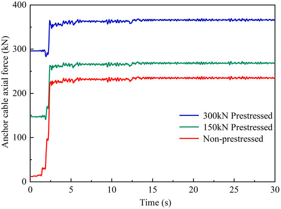 In this section, three cases for the anchors are set in the simulations, i.e., Case 1 with no prestress, Case 2 with prestress of 150 kN, and Case 3 with prestress of 300 kN. The time-history curves of the maximum axial force of the anchors with different prestresses are shown in Figure 10. Under seismic shaking, the anchors experienced rapid increments in the axial force at t = 2.5 s when the peak ground acceleration arrived, and then the axial force converged to a stable value. This suggests that the soil strongly pushed the pile to a tilt, leading to a rapid increase in the anchor tension but remaining within the elastic deformation range [57]. The anchor forces in Cases 1, 2, and 3 after seismic shaking are 236, 270, and 367 kN, respectively. The response of the anchor force is sensitive to the input seismic wave. The increment in the anchor force mainly occurs when there are significant changes in seismic acceleration amplitude, making the anchors susceptible to damage. Consequently, in the design of anchors, it is necessary to consider instantaneous increments in axial force caused by seismic loading in order to prevent the failure of the anchors.