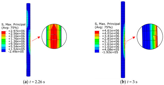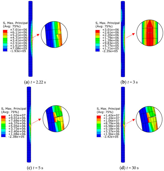 Figure 11 and Figure 12 show the propagation of cracks in the piles for the pile-supported and pile-anchor-supported conditions. Under seismic loading, the piles undergo bending due to slope deformation. As a result, one side of the pile experiences tension while the other side experiences compression. When the maximum principal stress exceeds the tensile strength of the pile, cracks initiate. For the pile-supported slope, a crack occurs at a depth of 7.75 m when t = 2.22 s, which is located at 1.75 m below the slip surface (Figure 11). For the pile-anchor-supported slope, a crack in the pile first appears at t = 2.26 s, located at a depth of 7.25 m (Figure 12). It seems that crack initiation in the pile body for both of the two support conditions occurs when the peak ground acceleration arrives. Then, the cracks gradually expand with continuous seismic loading. The maximum opening of the cracks in the pile-supported and pile-anchor-supported conditions are 0.98 and 0.36 mm, respectively.