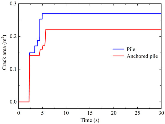 The output module ‘STATUSXFEM’ in ABAQUS is employed to output the node information of damaged units. The crack area is computed by summing the cross-sectional area of the damaged units. Figure 13 presents the evolution of cracks in the pile under seismic loading. The results indicate that crack growth in the pile body completes in a very short period, with two distinct increments of crack area observed. The first increment occurs when the peak ground acceleration arrives and is significantly larger than the second increment. Crack growth mainly happens during periods of significant changes in seismic acceleration amplitudes. The total crack areas for the pile-supported and pile-anchor-supported conditions are 0.27 m2 and 0.22 m2, respectively. According to Figure 11, Figure 12 and Figure 13, we can conclude that the anchors perform well in constraining crack growth in the piles. Under seismic loading, the failure pattern of the piles is tensile damage. Cracks initially emerge near the slip surface after the peak acceleration. Cracks in the pile body significantly weaken the performance of piles. Consequently, for the seismic design of piles, it is crucial to ensure the arrangement of stirrups near the concrete piles around the slip surface.