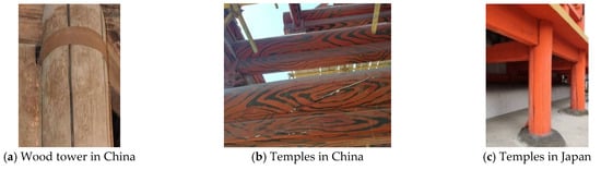 - Fan, C.; Wang, L.; Pan, J. Measures to control seasoning checks of wood used for the repair of the ancient wooden towers in Yingxian County, Shanxi Province. J. Beijing For. Univ. 2006, 1, 98–102. [Google Scholar]