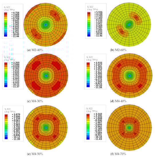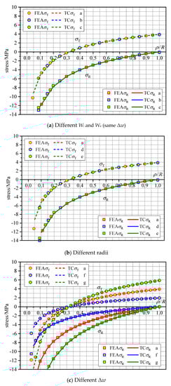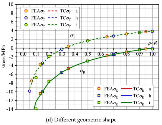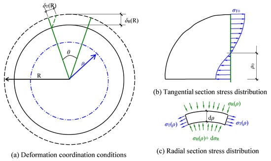- The tangential stress of the disc is manifested as compressive stress at the center of the circle while tensile stress at the circumference. There is a continuous change from the center of the circle to the circumference, and a critical tension–compression point r exists. In contrast, the radial stress is always compressive from r = 0 to r = 1.