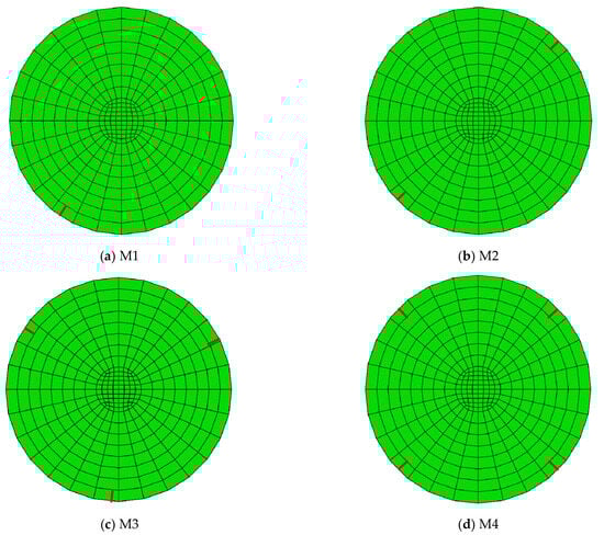| M4 | Disc | R = 50 mm | 4 | Equiangular distribution, 90° | 10% of the radius (5 mm) | 10% |