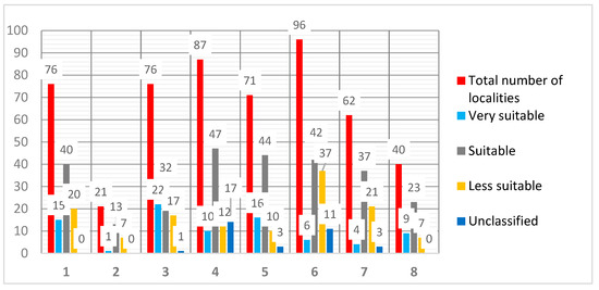 Overview of Slovak regions (1–8) with the number of potential localities for cluster developments (more detailed data in Supplementary Material) [32].