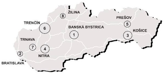 Map of the Slovak Republic with the Centers of Slovak regions (1–8), see Figure 2. The size of the circles represents the number of potential localities for clusters in the regions (authors’ figure).
