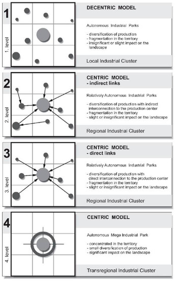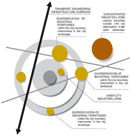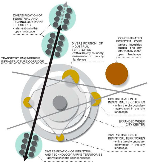 The results of the research presents models of how the city–industry–landscape relationship has developed. Until 1990 and partly up to the present, industry was located within the inner city and in factory zones at the boundaries of cities (Figure 4). In the present and in expected development, the multifunctional city center expands, and diversified production is located at the edges of cities (Figure 5). At the same time, new territories are being created for industrial and science–technology parks. The research confirmed four basic alternatives of the cluster models in Figure 6.