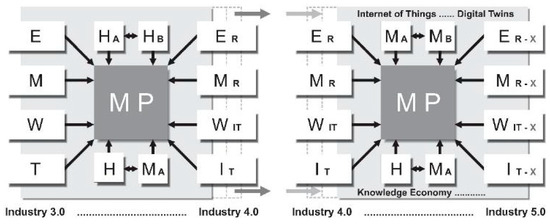 In material production (MP), the demands on work (W) are increasing in the environment of information technologies (WIT and WIT−X), and in the environment of digital twins, the Internet of Things, and the knowledge economy. Production technology (T) is increasingly focused on information technology (IT, IT−X).