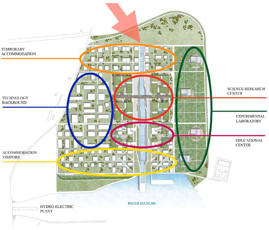 In Slovakia, the area surrounding the Gabčíkovo Hydro-electric Plant provides great potential for a Centric model of a transregional technology park cluster with a significant impact on the landscape. The cluster is based on sustainability and the SMART concept, with the main idea being to design a technology cluster in the green park/landscape. These are the theoretical considerations of the model studies presented in Figure 8.