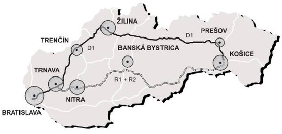 Map of the Slovak Republic with the transport arteries and important epicenters/cities with industrial parks and universities (knowledge and science centers); D1—highway, R1, R2—expressway (authors’ figure).