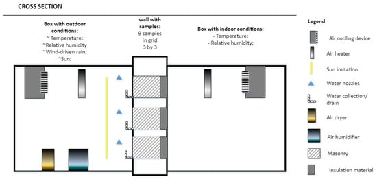 The test wall was installed between hot-box and cold-box climate chambers. The cold box simulates outdoor conditions by dynamically controlling the chamber’s temperature, relative humidity, wind-driven rain, and solar radiation. Hot-box refers to indoor conditions; this chamber maintained a constant microclimate, maintaining constant relative humidity and temperature. The cold-box chamber was equipped with a water spraying and collecting system on the outside side of the structure to replicate the effects of wind-driven rain (when rain is affected by wind, a large amount of water impacts vertical surfaces). The system consisted of 9 nozzles, one for each wall sample, a pump, plastic pipes for the water distribution system, and a water collection system (see Figure 2b). Solar radiation simulation lamps simulated exposure to the sun.