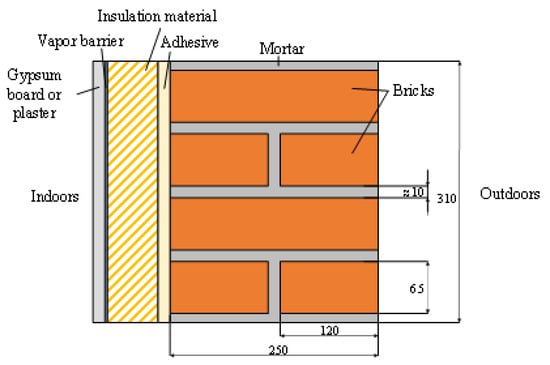 Each insulation system was attached to a single-leaf masonry sample built from industrially produced new bricks. New bricks were used to reduce the impact of uncertainty of material properties. Before starting the measurements, a conditioning period in the room condition was kept for the wall specimens to dry out. Figure 3 provides a simplified 2D model of the masonry sample in a cross-section from indoors to outdoors.