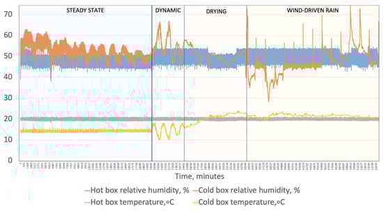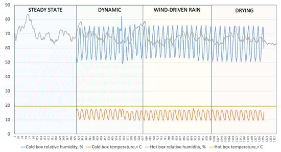The second test round with nine insulation systems (insulation systems (9–18) from Appendix A Table A1) started with steady-state conditions, followed by dynamic conditions, drying conditions, and wind-driven rain for spring conditions. Measured cold- and hot-box temperature and relative humidity during the second test round are presented in Figure 10.
