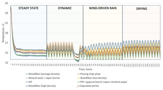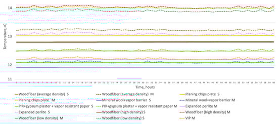 Figure 15 shows the zoomed-in measured (M) and simulated (S) temperature behavior between masonry and vapor-open insulation systems in the steady-state cycle. The highest temperature was measured behind vapor-open systems, while the lowest temperatures were reached in vapor-tight systems. For all insulation systems, the measured temperatures exceeded simulated temperatures and varied from 1 to 1.2 °C. For vapor-open systems, temperature stabilized at about +14 °C between masonry and planing chips plate, followed by high-density wood fiber and low-density wood fiber because their relatively low thermal resistance allows more heat flow from the hot-box. The temperature reached +13 °C for insulation systems with average-density wood fiber and expanded perlite. The simulated temperature behavior between these layers was also similar. However, the arrangement of the materials was slightly different. Similar to measurements, the lowest temperature was achieved by the mineral wool with a vapor barrier, followed by expanded perlite and average-density wood fiber. Moreover, the stabilization of temperatures was predicted to be at a slightly different range—from +12 to 13 °C. Vapor-tight insulation systems (PIR with gypsum board and vapor-resistant paper, VIP and mineral wool with vapor barrier) stabilized at lower temperatures than vapor-open systems.