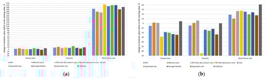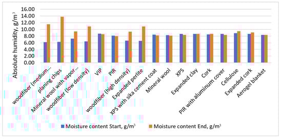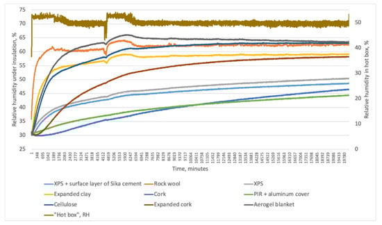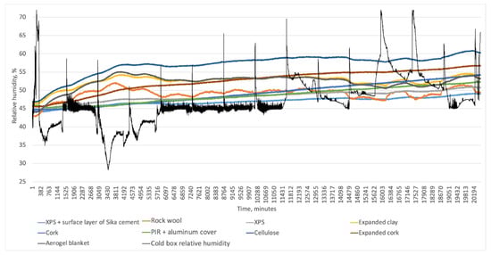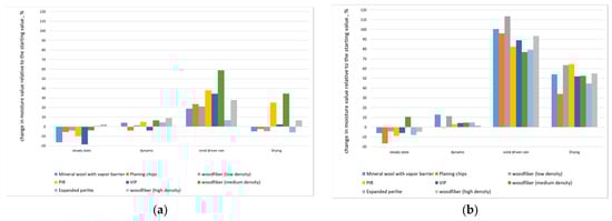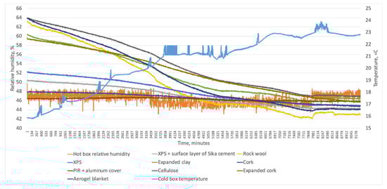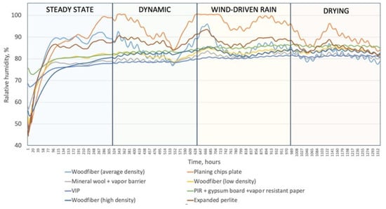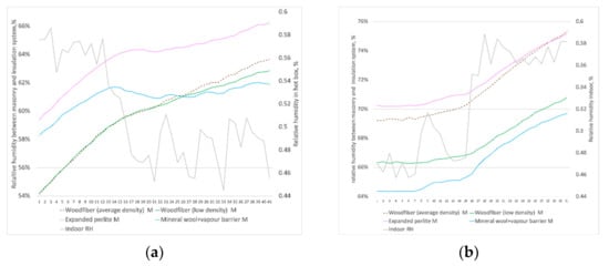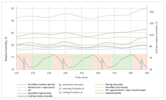 Figure 18 illustrates that vapor-open systems were sensitive to changes in indoor relative humidity when the cold-box temperature was stable. When indoor relative humidity fell between time 40 and 82 (Figure 18a), vapor-open materials with low Sd values (expanded perlite, average and low-density wood fibers) mimicked this behavior with an average time lag of one hour but with different trends. Vapor-tight mineral wool also mimicked it. This might be explained by the vapor barrier’s low Sd value (7). Materials with higher Sd values did not imitate this behavior (VIP, high-density wood fiber, PIR with gypsum board, and vapor-resistant paper). The same reaction of insulation systems was observed when the hot-box relative humidity increased (Figure 18b). In both situations, mineral wool followed the trend closer than other materials, which might be explained by the limited moisture buffering capacity for this type of insulation, in contrast to the capillary active materials. The behavior of other materials followed the trend to a lesser extent because they have excellent MBV.