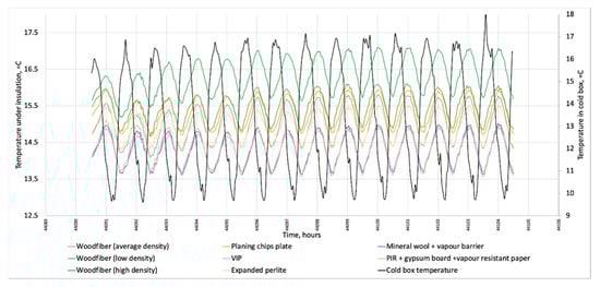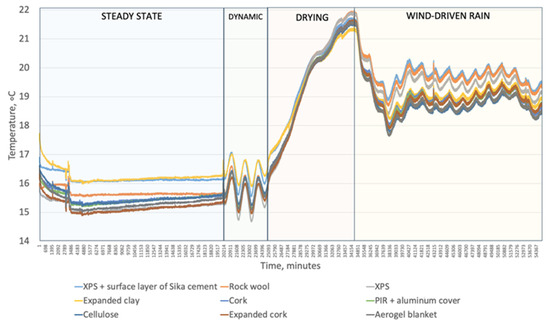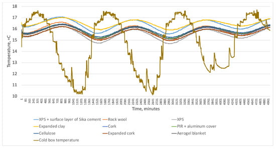 Figure 7 presents the measured temperature between insulation material and masonry for tested insulation systems during the first test round. Oscillations followed temperature dynamics in the cold box. The temperature in all insulation systems followed the same trend. However, the temperature reached various levels.
