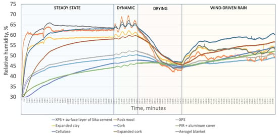 Figure 8 illustrates the measured relative humidity between insulation material and masonry for tested insulation systems during the first test round. The relative humidity in each insulation system exhibited different behavior in terms of amplitude and value. The oscillation amplitude was determined by temperature changes in the cold-box relative to the hot-box temperature and the hygrothermal properties of the insulation system. The overall relative humidity trend followed the relative humidity in the hot-box based on the hygrothermal properties of the insulation system.
