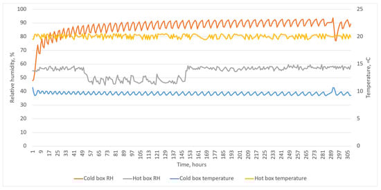 Measured cold- and hot-box temperature and relative humidity during the second test round.