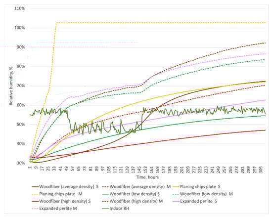 The measured and simulated behavior of relative humidity between masonry and vapor-open insulation systems are illustrated in Figure 16. The internal side of the existing wall structure experienced reduced temperatures, resulting in the higher relative humidity levels between the wall and insulation system. The temperatures reached steady-state conditions after approximately 72 h while relative humidity still had not reached equilibrium after 13 days except for planing chips plate. The relative humidity increased faster for the vapor-open materials due to the vapor-open characteristic of these insulation systems. All vapor-open systems experienced a much higher increase of relative humidity at the beginning of the measurement compared to simulation. They also reached higher relative humidity levels compared to simulation results. The planing chips plate had the highest increase rate of relative humidity behind the masonry and reached equilibrium at 100% in 30 h. This is due to large and open pores, low vapor diffusion resistance, and lack of finishing material. In simulation, planing chips plate behavior is different: the trend increased at a slower rate and it did not reach 100% relative humidity. This material is suggested to be used as an internal finish because of its decorative nature. However, the application of this material without vapor barrier under the high indoor moisture load can result in mold growth behind the insulation system. Average density wood fiber had the second highest relative humidity level and simulated behavior differed from measured. The third and fourth materials with the highest relative humidity were expanded perlite and low-density wood fiber. All these materials had low vapor diffusion resistance. The slowest increase of the relative humidity was observed for high-density wood fiber. The main reason for the discrepancy between measured and simulated behavior can be variations in material properties values in real material and simulation.