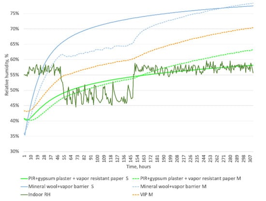 Measured (M) and simulated (S) behavior of relative humidity between masonry and vapor-tight insulation systems.