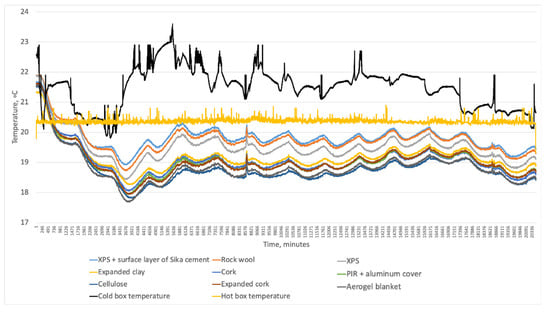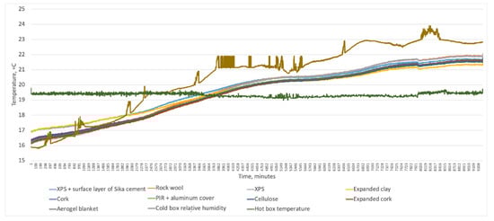 Figure 19 shows the temperatures that reached steady-state conditions after approximately 58 h. Temperatures below each material gradually decreased and stabilized between 15.3 C and 16.3 °C (the values were higher than the first test round due to higher temperature in the cold-box). The lowest temperatures reached XPS and expanded cork, coinciding with the measured U-values at the laboratory. PIR with aluminum cover measured U-value coincided with the U-value of an expanded cork. Still, when comparing temperatures below these insulations, the temperature below the PIR with aluminum cover was on the same level as the cellulose, whose U-value was 0.07 W/m2K higher. However, as these temperature differences were less than half a degree and fell within the error limits of temperature sensors, such small shifts were possible. Accordingly, expanded clay and XPS with the Sika cement layer, which had the highest U-values, also had the highest temperatures below these materials.