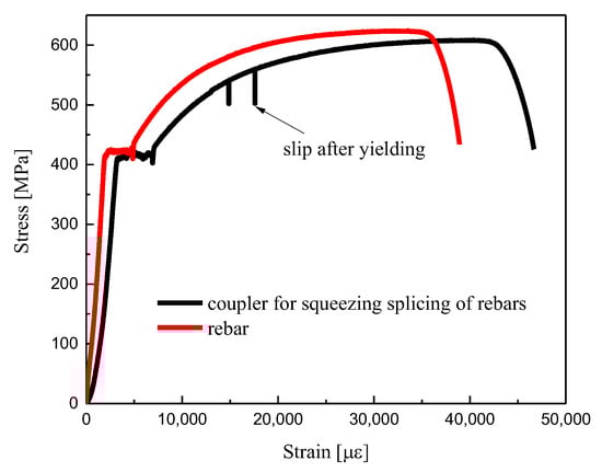 | Coupler for Squeezing Splicing of 20 mm Rebars | Yield Stress (MPa) | Ultimate Stress (MPa) | Young’s Modulus (MPa) |