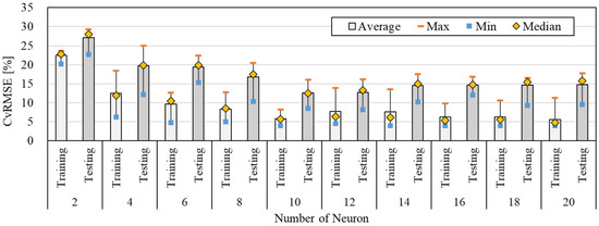 In this stage, the predictive performance of the model was analyzed by changing the number of neurons (Figure 5). The number of input variables was 5, and the size of the learning data was set at 60%. As the number of neurons increased, the average values of CVRMSE were in the range of 5.61–22.44% and 12.25–27.14% for the training and testing periods, respectively. These were within the acceptable range of 30% by ASHRAE Guideline 14. When the number of neurons was 20, the average value of CVRMSE was the lowest (5.61%) for the training period. In the case of the testing period, the average value of CVRMSE was the lowest (12.25%) when the number of neurons was 10. Moreover, the most accurate predictive performance was obtained when the number of neurons was 10, in which the values of average, minimum, and maximum CVRMSE were 12.25%, 8.56%, and 16.05%, respectively. When comparing the number of neurons between 10 and 2, the average values of CVRMSE for the training and testing periods decreased to 16.66% and 12.55%, respectively. When the number of neurons was 10, the predictive performance was improved by decreasing the values of CVRMSE gradually, while it was lowered by increasing the value of CVRMSE when the number of neurons was higher than 12. This indicated that the weight increased with the increase in the number of neurons, and overfitting was obtained. When the number of neurons was higher than 10, the standard deviation was in the range of 1.42–2.84, which showed more constant predictive performance than when the number of neurons was below 10. It showed that the most acceptable predictive performance was obtained when the number of neurons was 10. It can be seen that the increase in the number of neurons was not able to improve the predictive performance of the ANN model. Thus, it is important to find a suitable number of neurons by observing the model’s predictive performance. Table 6 shows the values of average, maximum, minimum, and standard deviation when increasing the number of neurons.