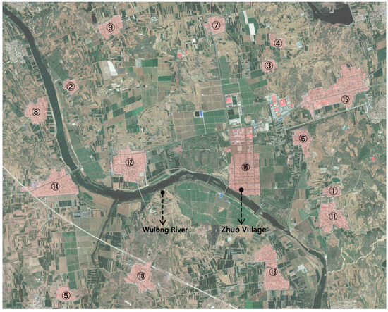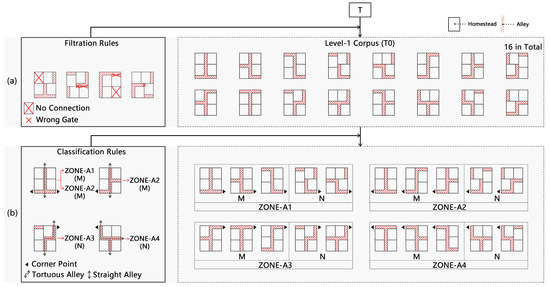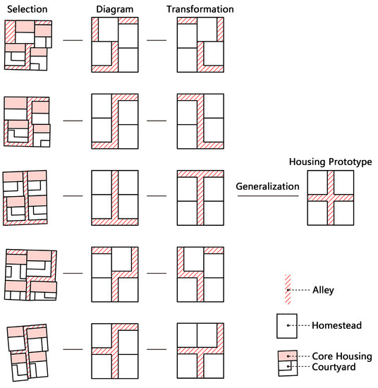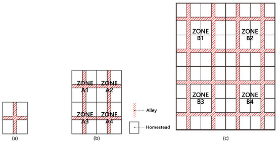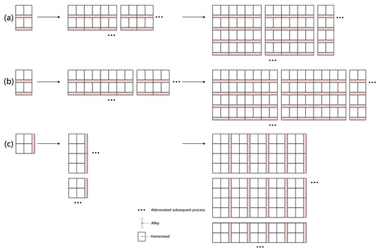- Adjustment rules—T3. If no side faced the main road, three homesteads became large homesteads, as shown in Figure 14e;