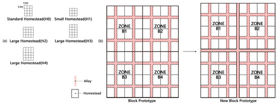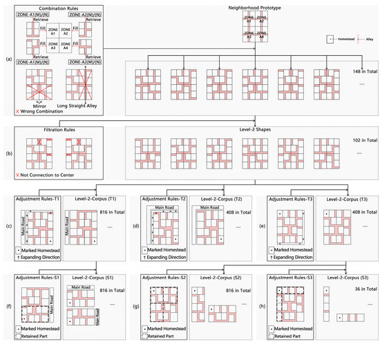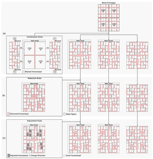 - Adjustment rules—T2. When two sides faced the main roads, seven homesteads became large homesteads, as shown in Figure 14d;