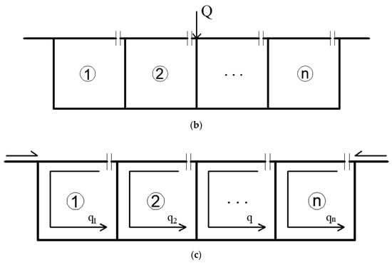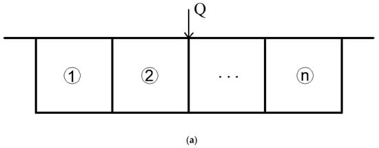 As shown in Figure 6, taking a thin-walled box girder with multiple boxes as an example, the original closed box room shear stress solution problem (a) can be decomposed into open box room shear stress (b) and closed box room unknown shear flow (c). Assuming that the shear flow distribution formed on the box girder section under the action of the shear force Q is , then can be calculated by Equation (20).