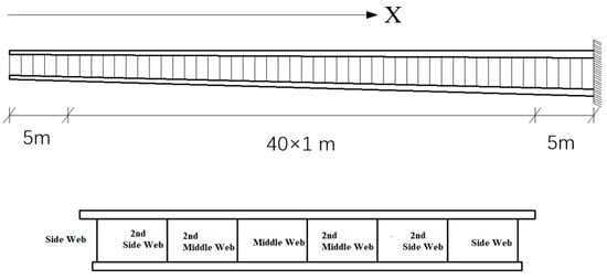 The definition of each web is shown in Figure 9. In research, the shear stress distribution is usually obtained in the regions or critical sections of interest. The specific sections to be considered depend on the research objectives and the characteristics of the structure. For example, in beam structures, it may be important to focus on the shear stress distribution at specific cross-sections, while in complex three-dimensional structures, the shear stress distribution throughout the entire structure may need to be considered. In order to avoid the influence of complex stress at the end, the bridge length of 40 m is cut as shown in Figure 9, and the section is taken every meter to calculate the shear stress.