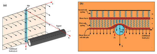 As shown in Figure 3a, the additional loads generated by the shield tunnel excavation not only act on the pile foundation but also significantly affect the soil next to the piles, parallel to the tunnel axis. The soil surrounding the piles also affects the displacement of the pile foundation, due to the inconsistent deformation of the ground and the pile foundation, as shown in Figure 3b.