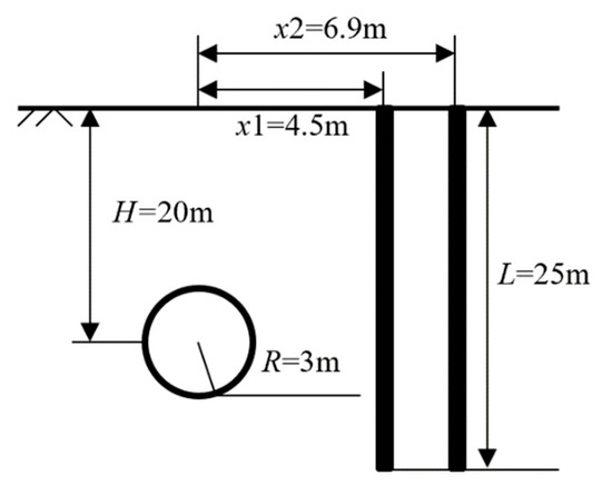 The 3D boundary element program GEPAN, which considers the three-dimensional effect of lateral soil in the solution process, was utilized to verify the accuracy of the method proposed in this paper. Loganathan [18] simulated the impact of shield tunnel excavation on the horizontal displacement of adjacent 2 × 2 group piles using the 3D boundary element program GEPAN. The soil was assumed to be a homogeneous and isotropic elastic medium with a constant soil strength of Cu = 60 kPa in the model above. The soil modulus was Es = 24 MPa. Piles were cylindrical structures made of uniform, isotropic elastic material with fixed elastic parameters. In the computer program GEPAN, a typical pile element discretization established the pile model. Both the piles and the surrounding soil mass deformed elastically, and the principle of superposition was applicable. Moreover, there was no slip between the piles and the soil at the interface. The distance between the front pile, the back pile, and the tunnel axis were 4.5 m and 6.9 m, respectively, as shown in Figure 5. The axial distance between the two piles was s = 2.4 m. The remaining calculation parameters related to the method in this paper are shown in Table 1.
