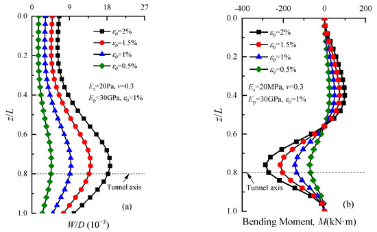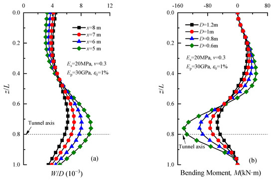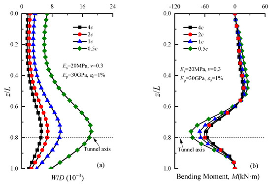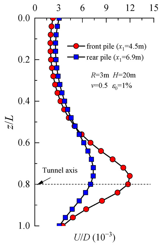 To analyze the impact of various factors on the deflection and bending moment of group piles using the method proposed in this paper, the following example was taken for analysis. The diameter R and the depth of the tunnel axis were 3 m and 20 m, respectively. A ground loss ratio ε0 of 2.5% was considered. The soil’s elastic modulus and Poisson ratio were 20 MPa and 0.3, respectively. The diameter D and the depth of the single pile were 0.6 m and 25 m, respectively. The elastic modulus of the single pile was selected as 30 GPa. Assuming that there were two piles with unconstrained top and tip, the front pile and back pile were located 5 m and 8 m from the tunnel axis, respectively. Moreover, the other parameters remained unchanged when analyzing a certain parameter’s influence on the pile foundation’s vertical displacement in the following.