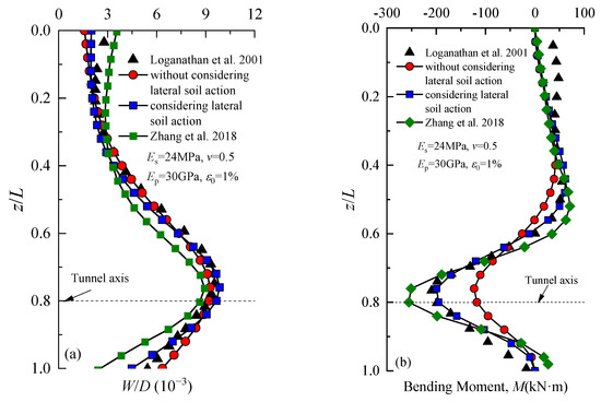 The presented method was validated by comparing it with existing solutions obtained from the boundary element program GEPAN. In addition, the proposed method was used to calculate the displacements and bending moments of a single pile and group piles induced by tunneling, while considering the effects of lateral soil displacements. A parametric analysis was conducted to assess the influence of various factors, including the stiffness of soil spring c, pile–tunnel distance, ground loss ratio ε0, and pile diameter D on group piles’ deflection and bending moment.