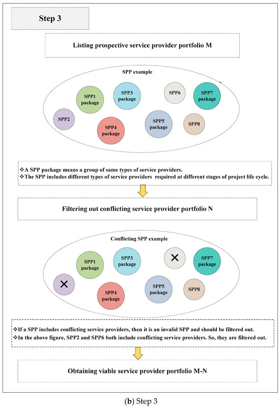 Based on Section 3.2, in order to meet the manufacturing tasks at each stage of the project life cycle, a certain number of service providers needs to be selected from the alternative sets at each stage to form an SPP, denoted as (). This SPP is labeled as a prospective SPP that includes conflicting SPPs and feasible SPPs. Affected by the different operating mechanisms and service methods of service providers, there are inabilities to cooperate among service providers, which is defined in this study as a conflict phenomenon. Under the influence of a conflict phenomenon, an SPP cannot complete the corresponding project construction tasks. Such an SPP is called a conflict SPP, which needs to be screened out in order to obtain feasible SPPs.