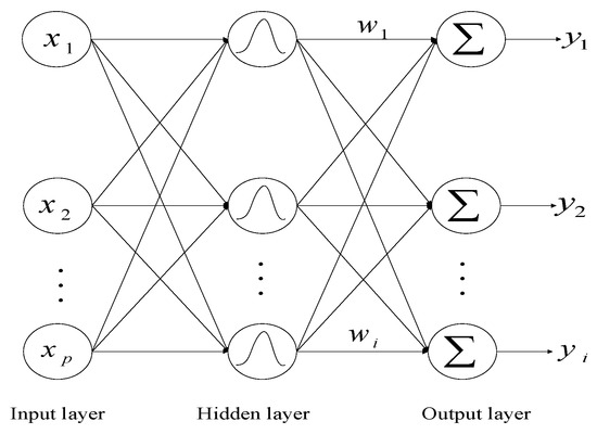 The RBFNN was first proposed by Moody and Darken [49]. It is a type of forward neural network and can approximate any continuous function with arbitrary precision. The structure of the RBFNN is similar to a multi-layer forward network comprising a single hidden layer, an input layer, and an output layer [30,50]. The input layer is composed of signal source nodes, and only plays a role in transmitting data and information; it does not make any changes to the input information. The number of hidden nodes in the hidden layer depends on the specific needs of the studied problem. The transformation function of the hidden nodes is a radially symmetric and attenuated non-negative nonlinear function with respect to the center point. The kernel function (action function) of neurons in the hidden layer is used to learn and train the data. In this way, the original linearly inseparable problem is made linearly separable so that it can be solved using a linear system of equations, which largely speeds up the learning efficiency and avoids local minima in the process [51]. The output layer can respond to the effects of the input modes. The transformation from the input space to the hidden layer space is non-linear, and the output layer space transformation from the hidden layer space is linear. The architecture of the RBFNN is shown in Figure 2.