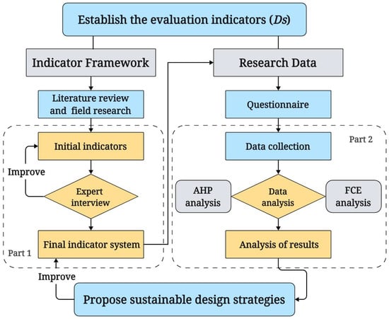 This study is grounded in the theory of local revitalization and employs the AHP–FCE method to assess key elements of regional sustainable development (Figure 2). Firstly, the objectives and questions of the study were clearly defined through a literature review and field research (questionnaires and semi-structured interviews), and initial impact indicators were proposed. Secondly, experts in the field of local revitalization were interviewed to rank these indicators and establish an indicator system. The panel of experts consisted of local community leaders, policymakers, scholars, and senior social workers, all of whom have extensive experience and research backgrounds in this field. Subsequently, a Likert scale-designed questionnaire was distributed to collect assessment scores. The research sample was drawn from randomly selected residents of frontier communities who volunteered to participate, representing diverse socioeconomic backgrounds, including local residents, social workers, government officials, and laborers, among others. The analytic hierarchy process (AHP) was applied to calculate the weight values of the indicators, followed by fuzzy comprehensive evaluation (FCE) to conduct a comprehensive assessment of the indicator system. Finally, based on the results of the analysis, sustainable design strategies for regional revitalization in Qianfeng Community were proposed.