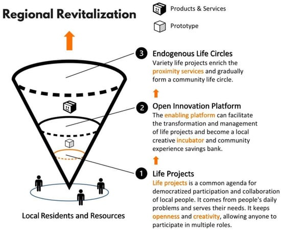 Regional revitalization utilizes local resources and the participation of diverse stakeholders to address issues of local development decline []. Based on Wright’s theory of social empowerment through socio-economics, it is proposed that social entities can achieve social empowerment by directly participating in economic activities and sharing the benefits of development []. Therefore, we suggest promoting the self-organization and participation of residents in local economic co-production through the proposal of life projects that revolve around the local needs and issues in Qianfeng Community, gradually enhancing local talent empowerment. In other words, life projects can serve as triggers for empowering diverse stakeholders to participate in regional revitalization, representing a shared agenda for democratic participation and cooperation among local people [,,]. Typically, life projects are based on the exploration and development of local resources, adopting a bottom-up open innovation model []. Diverse stakeholders collaboratively promote the incubation of life projects, developing local products and services to meet local needs. Therefore, an open innovation platform that facilitates the incubation of life projects is essential.