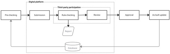 The to-be digital permit process presented in the European Project CHEK Digital Toolkit for DBP [55] represents a transition of the synthesis of comparisons from current as-is processes into a fully digitalized and automated process (Figure 3). The digital process should enable applicants to pre-check their projects prior to submission. This guarantees that the application is consistent with the municipality’s requirements and allows the applicant to have an overview of the outcome. Pre-checking increases efficiency by reducing errors in submitted projects while also improving transparency around checking results.