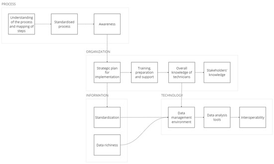 The main categories have capability sets that measure the maturity of the overall category. The process category is divided into process steps, timeline and transparency of the process, regulatory aspects, and awareness regarding some determined technology. The organizational maturity is measured by the individual and collective knowledge of the staff members, the strategic objectives of the organization, and the capabilities to train internal and external partners. The technology category indicates data management, data analysis, and the interoperability of data and tools. Lastly, the information category is assessed by the quality of data and information, special capabilities, codes and regulations in machine-readable formats, and the lifecycle of the information workflow.