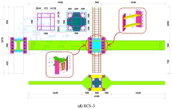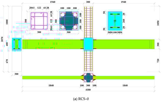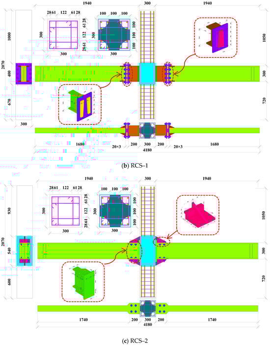 This article has created four 1/2 scaled specimens of beam–column exterior joints for a prototype frame structure with multiple levels, boasting a floor height of 4 m and a beam span of 7.4 m. The specimens feature a column height of 2000 mm and a beam height of 3700 mm. The joint design is based on the design criteria “strong column, weak beam” and “strong shear, weak bending” in the GB/T 50011-2010 “Code for Seismic Design of Buildings” []. To simplify the disassembly of the RCS joint, bolt connections were used. The specimens are categorized into four types based on the various forms of beam–column joint connections, namely RCS-0, RCS-1, RCS-2, and RCS-3. Figure 1 shows the detailed dimensions and overall size of the specimens.