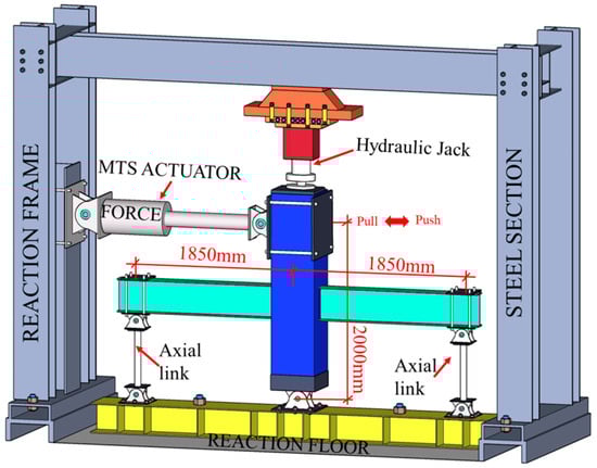 The experimental loading apparatus comprises a robust steel framework, a 500 kN MTS hydraulic servo actuator, a vertical hydraulic jack, a firm steel beam, anchor bolts, and auxiliary loading devices such as beam end clamps and column bottom sleeve hinge bearings. Figure 2 shows the complete apparatus. The demountable RCS joint specimen is scheduled for static testing via the application of vertical loads to the column top through hydraulic jacks, controlling the axial stress ratio, followed by horizontal reciprocating loads at the end of the column. The loading protocol for this experiment conforms to the “Code for Seismic Testing Methods of Buildings” (JGJ101-2015) [], and the loading regime for the planned static testing of the specimen utilizes a full-stage displacement-controlled loading configuration. The loading displacement value is controlled by multiples of the interlayer displacement angle, and each loading is repeated twice. The loading system is depicted in Figure 3. In the later phase of the experiment, it is crucial to remember that loading ceases when the lateral load on the specimen decreases to 85% of the peak load or cannot be sustained any longer.