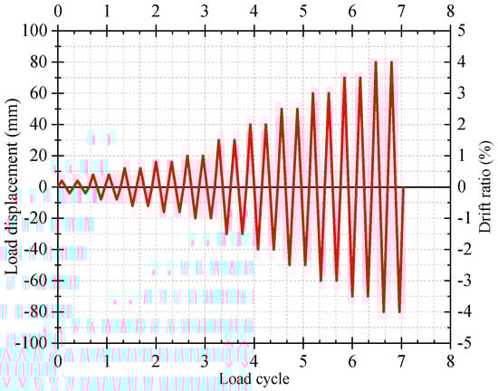 To replicate the experimental loading process, the control points were linked to the underside of the concrete column and the beam end section, employing the “coupling” function. The displacement and rotational degrees of freedom for the control points, i.e., the six degrees of freedom, were then restricted in the X, Y, and Z planes to ensure comparable boundary conditions to the experimental loading process. The reinforcing steel of the concrete column was incorporated into the corresponding concrete components using the “Embedded Region” instruction to allow the steel and concrete to function together under load and deformation. The “Tie” directive was utilized to limit the welded connections between steel members. Surface-to-surface contact between steel components was established with contact pairs, which included bolt–plate and plate–plate contact. A vertical constant uniformly distributed load of 8 Mpa was applied at the top of the column to meet the 0.2 axial pressure ratio of the experimental frame column. Additionally, a cyclic horizontal load was applied at the column end, as demonstrated in Figure 5.