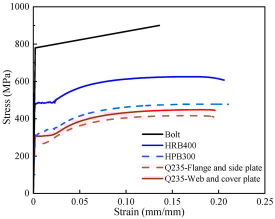Stress–strain curves of the bolts, reinforcement, and steel.